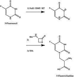 The synthesis of 5-Fluorowillardiine may be achieved by using 5-Fluorouracil as a nucleophile to open a specialized lactone in an SN2 reaction. Another straightforward approach is to perform a Strecker amino acid synthesis.[17][18]