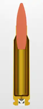 The 5.56×45mm NATO (official NATO nomenclature 5.56 NATO, commonly pronounced "five-five-six") is a rimless bottlenecked centerfire intermediate cartridge family developed in the late 1970s in Belgium by FN Herstal.[5] It consists of the SS109, L110, and SS111 cartridges. On 28 October 1980, under STANAG 4172, it was standardized as the second standard service rifle cartridge for NATO forces as well as many non-NATO countries.[5][6][7] Though they are not identical, the 5.56×45mm NATO cartridge family was derived from the .223 Remington cartridge designed by Remington Arms in the early 1960s, which has a near-identical case but fires a slightly larger 5.70 mm (.2245 in) projectile.