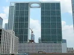 500 Brickell is a residential complex in the Brickell neighborhood of Miami, Florida, United States. The complex consists of two condominium towers, 500 Brickell West Tower and 500 Brickell East Tower. The two buildings were designed as twin towers, and rise 426 feet (130 meters), with 42 floors.[1] Both skyscrapers were designed by the Arquitectonica architectural firm and the complex was developed by Thomas Kramer's Portofino Group in partnership with the Related Group of Florida. The towers' construction began in April 2005,[2] was topped out in mid-2007 and was completed in 2008.