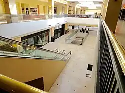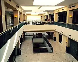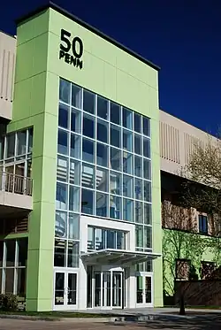 The complex was built in 1973 by C.W. Cameron, founder of American Fidelity.[2] For the next twenty years it was a landmark due to four red piggy bank signs (One on all four sides of the Elevator tower on top of the building.) with a big "S" in the center, belonging to Sooner Federal Savings and Loan who had their home offices in the Building at the time. It was also formerly home to a couple of Oklahoma locally owned chain of high end retail stores such as Balliets a women's boutique and the flagship store of Orbach's which closed in 1990. Although not currently anchored by a major retailer, 50 Penn Place still has upscale shops and restaurants, a brewpub, independent bookstore, the 50 Penn Place Art Gallery, and various office tenants including LexisNexis. In recent years, the retail portion of the complex has lost the majority of its tenants to other nearby shopping venues, such as Penn Square Mall right across the street, and Classen Curve a newly built modern upscale shopping center in Nichols Hills. Because of this, 50 Penn Place is no longer seen by locals as an upscale shopping destination. However, several upscale tenants still remain, and former retail space is being leased to other tenants, such as ITT Technical Institute. In March 2011, In-Rel Properties purchased the building for $15.25 million and invested over $1 million in renovations.[4]