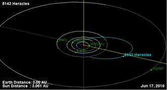 5143 Heracles (provisional designation 1991 VL) is a highly eccentric, rare-type asteroid and synchronous binary system, classified as near-Earth object of the Apollo group, approximately 4.8 kilometers in diameter. The asteroid was discovered on 7 November 1991, by American astronomer Carolyn Shoemaker at Palomar Observatory in California, United States.[3] It is named for the Greek divine hero Heracles.[2] It has an Earth minimum orbit intersection distance of 0.058 AU (8.7 million km) and is associated with the Beta Taurids daytime meteor shower.[24]