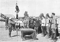Mikhail Frunze presents divisional commander Pavel Dybenko with an honorary revolutionary red banner in Crimea in 1921