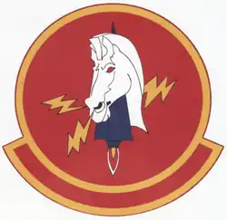 - ^ Approved 23 April 1963. Description: On a red disc edged Air Force golden yellow, an Air Force blue stylized missile in palewise upward flight emitting Air Force golden yellow, red, and white exhaust to base, all surmounted by a white Trojan horse's head in profile, his eye red, outlines and details black; originating in sinister an Air Force golden yellow lightning bolt disappearing behind the horse's head and issuing from the horse’s nostrils to dexter and dexter base. Significance: Against a scarlet background (to represent valor), the head of a white Trojan horse, his eye flashing red, his nostrils emitting lightning bolts, represents the strength and might of this unit. The stylized missile indicates this unit's space age weapons system.