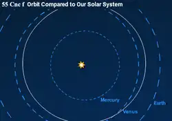 55 Cancri f is located about 0.781 AU away from the star and takes 262 days to complete a full orbit.[10] A limitation of the radial velocity method used to detect 55 Cancri f is that only a minimum mass can be obtained, in this case around 0.144 times that of Jupiter, or half the mass of Saturn.[10] A Keplerian fit to the radial velocity data of 55 Cancri A indicates that the orbit is consistent with being circular, however changing the value in a range between 0 and 0.4 does not significantly alter the chi-squared statistic of the fit, thus a representative eccentricity of 0.2±0.2 was assumed.[1] In a Newtonian model which takes interactions between the planets into account, the eccentricity comes out as 0.0002, almost perfectly circular.[1]