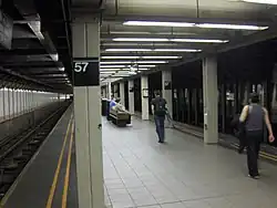 Elevators to the platforms had been under design for several years, with the MTA originally planning to award contracts in November 2013,[14] but the design process was delayed because of preexisting utilities blocking the way of the proposed elevator access.[15] Other issues included asbestos abatement, the lack of available space underground for the expansion of the mezzanine, and the need to negotiate with another developer to install elevators. The MTA started working on a revised design in September 2015, and the construction contract was awarded in December 2017, allowing the start of construction.[16] Ultimately, the location of the platform elevators was moved to the southern end of the station, near 55th Street, necessitating the installation of a new street-to-mezzanine elevator at 55th Street.[14][17] The elevators were opened in May 2021.[18]