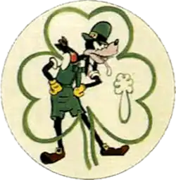 - ^ Approved 6 March 1944. Description: "Goofy" dog proper, wearing a white shirt, green jacket, tie, trousers and hat, yellow orange shoes, yellow gloves, standing with feet spread apart, hands on hips, and supporting a small black and red aerial bomb on the right shoulder, holding a white clay pipe between the teeth, all before a shamrock formed by a light green outline; shamrock charged in sinister leaf with stylized white aerial bomb outlined green.