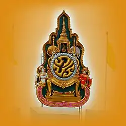 There are several symbols in the emblem. The centerpiece is a cypher of the king's name in golden yellow, the colour of Monday, his day of birth. The cypher is set on a blue background, which is a royal colour. The device is encircled with diamonds, which symbolise wise men, important authors, craftsmen, the sacred white elephant, graceful women, vigorous soldiers, and public servants.
