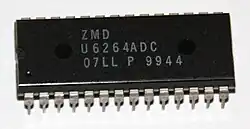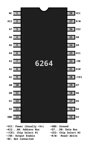 The 6264 is a JEDEC-standard static RAM integrated circuit. It has a capacity of 64 Kbit (8 KB). It is produced by a wide variety of different vendors, including Hitachi, Hynix, and Cypress Semiconductor. It is available in a variety of different configurations, such as DIP, SPDIP, and SOIC. Some versions of the 6264 can run in ultra-low-power mode and retain memory when not in use, thus making them suitable for battery backup applications.