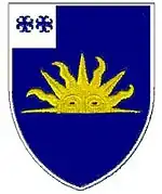 The shield is Infantry blue with demi-sun. A rising sun is on the arms of the state of New York, and California is the state of the setting sun. The 63rd Infantry was originally organized in California and after World War I performed guard duty in New York state. The 12th Infantry from which the personnel were drawn, is indicated by the canton