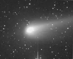 Churyumov–Gerasimenko was discovered in 1969 by Klim Ivanovich Churyumov of Kyiv University's Astronomical Observatory,[26] who examined a photograph that had been exposed for comet Comas Solà by Svetlana Ivanovna Gerasimenko on 11 September 1969 at the Alma-Ata Astrophysical Institute, near Alma-Ata, the then-capital city of Kazakh Soviet Socialist Republic, Soviet Union. Churyumov found a cometary object near the edge of the plate, but assumed that this was comet Comas Solà.[27]