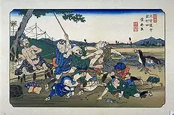 The 69 Stations of the Nakasendō (中山道六十九次, Nakasendō Rokujūkyū-tsugi) are the rest areas along the Nakasendō, which ran from Nihonbashi in Edo (modern-day Tokyo) to Sanjō Ōhashi in Kyoto.[1][2] The route stretched approximately 534 km (332 mi) and was an alternate trade route to the Tōkaidō.[1]