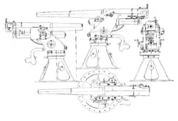 The M/16 was a relatively simple design. It was intended for static emplacement, and was mounted on a pedestal, allowing for 360° sideways movement. The mount allowed for an angle of elevation of between -1° and 75°. The gun barrel was 45 calibres long, and had 28 grooves (rifling) twisting to the right. The breech block was a semi-automatic horizontal-wedge - the gunner had to manually open it to remove the case from the previous shot, but it closed automatically on the insertion of a new round. There was a Hydro-pneumatic recoil cylinder under the barrel, with a heavy spring to aid the forward motion of the gun at high elevation. It was originally designed to fire under local command, but was later equipped to receive gun-laying information from a central sight.