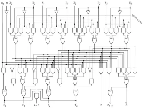 Logic diagram for the 74181 ... There are 63 logic gates.