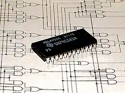 The 74181 is a 4-bit slice arithmetic logic unit (ALU), implemented as a 7400 series TTL integrated circuit. Introduced by Texas Instruments in February 1970,[1] it was the first complete ALU on a single chip.[2] It was used as the arithmetic/logic core in the CPUs of many historically significant minicomputers and other devices.