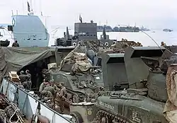 The battalion continued its training in England, where it was selected to become part of the D-Day assault force. Training first with British Valentine tanks specially equipped with the duplex drive amphibious propulsion system beginning in January 1944, they later received similarly equipped M4s with which to continue training.[9] The units loaded out their equipment in late May and waited in port for the final order for the assault landings.[10]