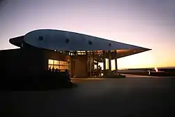 Whilst flying in the air and pondering the design, Hertz imagined a floating roof that would hang over the site to minimize structural obstructions of the views of a nearby mountain ridge. Hertz's initial concept sketches showed a site section with a curved ceiling and a roof form that reminded him of the wing section of an airplane. The wing, a self-supporting structure, cantilevers off the fuselage of an airplane like an outstretched arm. This requires little vertical support and only a few walls, which is ideal for a structure to minimize obstructions and maximize views.[3] Creating a wing foil shaped roof would be complex and difficult to build conventionally.[3] Through examining and exploring a variety of actual wing dimensions, Hertz determined that the wings from a 747 would fit on the existing pads and that they were already oriented to keep the views. The low profile of the wings was integrated into the ridge top, and the wing made to appear to cascade down and float above the ground. Utilizing the wings as 100% post-consumer recycled components and appropriating them in creative new ways is consistent with the existing context of Duquette's structures of found objects and emblematic of Hertz's thoughts on the "disposable" nature of our society.[4]