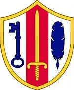 - Shoulder patch: An escutcheon with a red field and a blue chief, separated by an olive drab line; a three-pronged white device is superimposed on the blue chief.