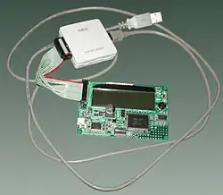Regarding software development tools, C compilers and macro-assemblers are available.[11]: 99 As for development tool hardware, full probing-pod type and debug port type in-circuit emulators,[12][13] and flash ROM programmers[14]: 22–24 are available.