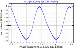 78 Virginis is a variable star in the zodiac constellation of Virgo, located 175 light-years from the Sun. It has the variable star designation CW Virginis and the Bayer designation o Virginis; 78 Virginis is the Flamsteed designation. This object is visible to the naked eye as a faint, white-hued star with an apparent visual magnitude of 4.92. It is moving closer to the Earth with a heliocentric radial velocity of −10 km/s.[3]