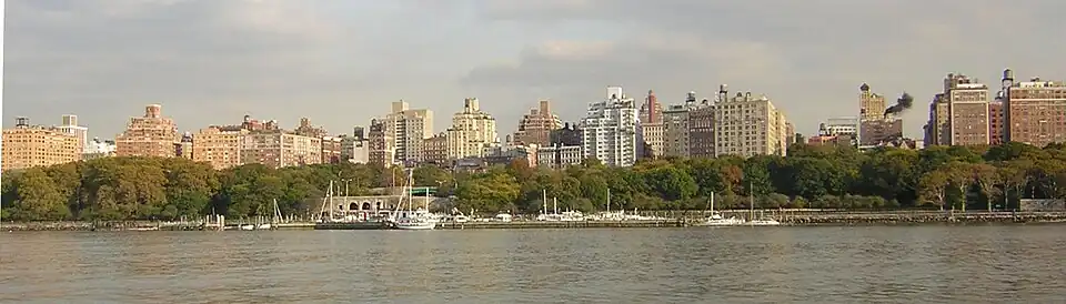 The interchange on the Hudson River and the boat basin was first proposed in 1934 and was constructed by 1937 during the tenure of Robert Moses as Parks Commissioner. It was part of the "79th Street Grade Crossing Elimination Structure" which created a grand architectural multi-level entry and exit from the Henry Hudson Parkway while eliminating a grade crossing of the New York Central Railroad's West Side Line by covering it over and creating the Freedom Tunnel.[6] Designed by Gilmore David Clarke, the Works Projects Administration provided $5.1 million for the project, which also included an underground parking garage, a restaurant, and the marina.[7]