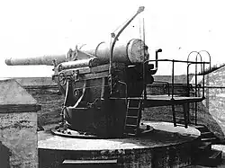 The M1888 8 in (203 mm) gun was a coastal artillery gun initially deployed as part of the Endicott system of fortifications. The first nine were deployed on the M1892 barbette carriage in 1898, but the improved M1894 and M1896 disappearing carriages soon became available, and approximately 64 additional weapons were deployed on these carriages by 1908. An "emergency" converted Rodman carriage was also used during the Spanish–American War in 1898 to quickly arm 21 emplacements with the modern 8-inch M1888 gun.[4][5] These weapons were redeployed soon after the war ended. The disappearing carriage allowed the gun to remain behind a parapet resembling a hillside most of the time, thus largely invulnerable to low-angle enemy fire, which was the only type of enemy attack anticipated 1898–1910. Air and high-angle artillery attack would eventually severely impact US fortifications in the Philippines in World War II.
