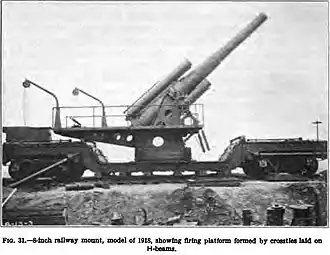 After the American entry into World War I, the United States needed a medium-range heavy artillery piece that could be transported easily. The quick solution was to take the existing 8-inch coast artillery guns from the fixed mountings or from storage and mount them on a drop bed rail car.[7] This was also done with a number of other weapons, including 10-inch (254 mm) guns, 12-inch (305 mm) guns, and 12-inch mortars. The 7-inch (178 mm) guns, 8-inch guns, and 12-inch mortars used a common carriage, with a depressed center and two 4-wheel or 6-wheel bogies. The bogies were interchangeable for standard gauge or (with 12-wheel bogies) 60 cm (23.6 in) gauge track. Outriggers and a rotating mount allowed all-around fire. This allowed the weapons to be used in coast defense against moving targets. A detailed description of the railway mounting is given in Railway Artillery, Vol. I by Lt. Col. H. W. Miller, USA.[8]