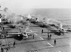 806 Naval Air Squadron reformed at RNAS Brawdy (HMS Goldcrest), Pembrokeshire, on 2 March 1953. It was equipped with Hawker Sea Hawk F.1, being the first Fleet Air Arm front-line squadron in the Fleet Air Arm to use the type.[22] It embarked, to take part in angle-deck trials, later in 1953, on the United States Navy's aircraft carrier USS Antietam.[23] The Hawker Sea Hawk was first introduced to the FAA squadron in 1953, replacing the Supermarine Attacker jet and the Hawker Sea Fury piston-engine fighters. The inaugural production model of the Seahawk F.1 took to the skies on 14 November 1951, while the last production variant, the FGA.6, was handed over in early 1956.[22]