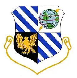 - ^ Approved 12 January 1956. Description: First and fourth quarters bendy of eight, azure and argent; the second quarter argent, over a lightning bolt in bend sinister, a sphere all proper, two aircraft volant sable with a trailing stream of power gules encircling the sphere; third quarter sable an eagle rising, wings elevated and displayed or.