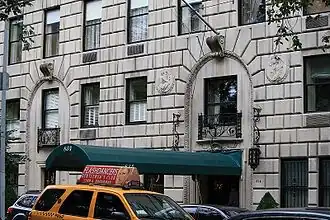 834 Fifth Avenue is a luxury residential housing cooperative on the Upper East Side of Manhattan, New York City.[2] It is located on Fifth Avenue at the corner of East 64th Street opposite the Central Park Zoo. The limestone-clad building was designed by Rosario Candela, a prolific designer of luxury apartment buildings in Manhattan during the period between World War I and World War II.[3][4] 834 Fifth Avenue is widely regarded as one of the most prestigious apartment houses in New York City. It has been called "the most pedigreed building on the snobbiest street in the country’s most real estate-obsessed city" in an article in the New York Observer newspaper.[5] This status is due to the building's overall architecture, the scale and layout of the apartments, and the notoriety of its current and past residents. It is one of the finest buildings designed by Rosario Candela, according to The New York Times.[6]