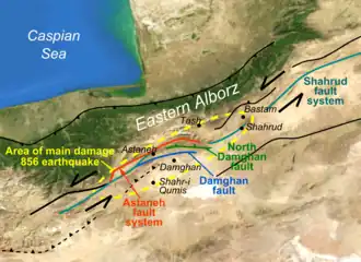 - ^ a b c d Hollingsworth, J.; Nazari H.; Ritz J.-F.; Salamati R.; Talebian M; Bahroudi A.; Walker R.T.; Rizza M.; Jackson J. (2010). "Active tectonics of the east Alborz mountains, NE Iran: Rupture of the left-lateral Astaneh fault system during the great 856 A.D. Qumis earthquake" (PDF). Journal of Geophysical Research. 115 (B12313). American Geophysical Union: B12313. Bibcode:2010JGRB..11512313H. doi:10.1029/2009JB007185. S2CID 30506709. Retrieved 15 October 2011.
