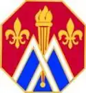 A gold color metal and enamel device 1 1/8 (2.86 cm) in height overall consisting of a red octagon (two vertical sides longer than the other six sides which are all equal) charged with a gold torch between two gold fleurs-de-lis, in base two white chevronels in front of the torch base with the internal area blue. The elements of the design reflect the history of the 89th Division, for whom the insignia was originally authorized: The gold torch symbolizes the 89th Division's peacetime role as a training unit. The two fleurs-de-lis allude to the division's service in France during World Wars I and II. The chevronels represent support and also simulate the letter "M" for "Midwest," the geographical source of the division's original personnel. The chevronels over the blue background also allude to the crossing of the Rhine River by the division in World War II.