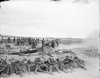 The battery came under the command of 50th HAG on 16 November, in time for Third Army's great tank attack on 20 November (the Battle of Cambrai). 50th HAG was assigned to III Corps, which used its 'heavies' to support individual attacking divisions as well as for CB fire. Efficient flash spotting and sound ranging ensured 90 per cent accuracy of the CB fire, and the combination of tanks and artillery on III Corps' front overwhelmed the Hindenburg Line defences. However, getting the batteries forward to support follow-up attacks on succeeding days proved difficult, and the attacks fell short of a complete breakthrough.[26][43][44] When the German counter-attacks broke through on 30 November, the battery prepared for withdrawal before 10.00, calling up the horse teams from the wagon lines. The situation seemed to improve so the guns opened fire again and continued in action on the Quentin ridge until the last moment. Heavy shelling had rendered two 'hopelessly out of action' and damaged the others. They withdrew to Metz as the Germans overran the position. One gun situated in a sunken road south of Marcoing was damaged by shellfire and had to be abandoned as the rest got away.[45]