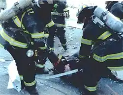 On the day of the attacks, there were a number of disabled individuals in the World Trade Center; there was a revised evacuation plan in place after the 1993 attack as many had been told to wait for rescuers and some waited up to nine hours.[68][69] Some like John Abruzzo, a quadriplegic, and Tina Hansen were able to evacuate, as Abruzzo was carried by coworkers from the 69th floor down in an evacuation chair and indicated that it took them about ninety minutes to reach ground level. The chairs were some of the about 125 that were purchased after the 1993 bombing, however there was varying levels of training and communication about them.[70] Others such as Michael Hingson, who was born blind, were able to evacuate from the 78th floor of the North Tower with the help of his guide dog Roselle.[71]
