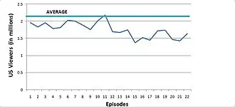 The season premiere was watched by 1.96 million live viewers in the United States and achieved a 0.9 rating in the adults 18–49 demographic, up 22.5% in viewers and 12.5% in demo from the season two finale.[1] Episode 11 achieved season highs in all key demos with a 1.1 adults 18–49 rating, a 1.4 in adults 18–34 and a 2.1 rating in The CW's target demographic of women 18–34. It was also the most watched episode since October, 2009 with 2.18 million viewers tuning in.[11] Episode 15 hit series lows in women 18–34 with a 1.0 rating and matched series lows in adults 18–49 with a 0.7 rating.[15] The season finale scored a 0.8 rating in adults 18–49, which was lifted to a 1.2 rating with a full week of DVR viewing taken into account.[56] The season averaged 1.75 million viewers and a 0.9 rating in adults 18–49. With live+7 day DVR viewing taken into account, it averaged 2.26 million viewers and a 1.2 rating.[57] In the UK episode eight was seen by 548,000 viewers, which was higher than the pilot episode "We're Not in Kansas Anymore".[58] "Best Lei'd Plans" continued upwards with 604,000 viewers becoming the No. 2 rated show on E4 that week.[58]
