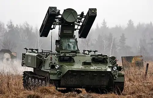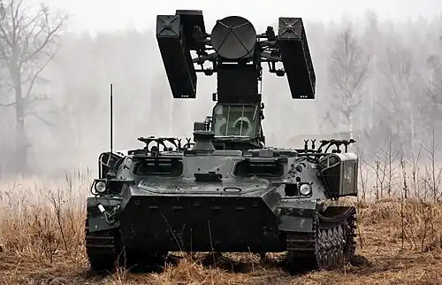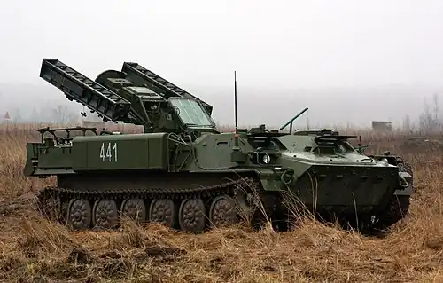 A Strela-10 from the Ukrainian Armed Forces was recorded running over a civilian car in the opening weeks of the war. The driver of the car was uninjured.[18] A Russian Strela-10M guarding Snake Island was destroyed by a Bayraktar TB2 on 30 April 2022.[19] A Ukrainian Strela-10M system was reported destroyed by the Russian Air Force near Lisichansk on 17 June 2022. [20] A Russian source claimed in September 2023 that Russia uses the 9M333 missile in Ukraine.[21]