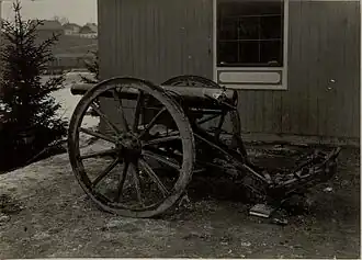 The 9 cm Feldkanone M 75/96 was a field gun used by Austria-Hungary during World War I,[1] a modernized version of the M 75 field gun. Virtually all the M 76s were upgraded during 1898. For cost reasons the new gun retained the bronze barrel of the original, although it was actually redesigned to withstand the more powerful propellants coming into use. A touch hole lock was added to prevent accidental misfiring when the breech was open. A spring-mounted spade brake reduced recoil from 5–6 metres to 80 centimetres, although it only worked if the spade was buried in the ground. A depression lever was added to elevate the carriage's trail to allow the gun greater depression in mountainous areas. Many guns had shields added after the outbreak of World War I.
