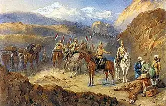The regiment was posted to Afghanistan in 1878 and marched through the Khyber Pass in March 1879 as part of the cavalry brigade led by General Hugh Henry Gough.[14] Following the murder of the British ambassador and his guards at Kabul in September 1879, the regiment saw action at the Battle of Charasiab in October 1879 during the Second Anglo-Afghan War.[12] The commanding officer of the regiment, Lieutenant-Colonel Robert Cleland, was killed while leading a charge at the Battle of Killa Kazi in December 1879.[12] Major-General Frederick Roberts described the ensuing events: