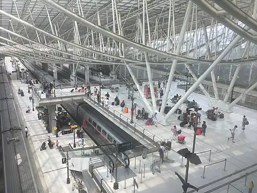 Aéroport Charles de Gaulle 2 TGV station (French pronunciation: [aeʁɔpɔʁ ʃaʁl də ɡol dø teʒeve]) is a major passenger railway station in Tremblay-en-France, France. It is directly beneath terminal two of Paris Charles de Gaulle Airport (between the C/D and E/F concourses) and is operated by the SNCF. The station was opened in November 1994 by President François Mitterrand.[3] It connects the airport to Paris and to various other cities in France, as well as to Belgium and the Netherlands.