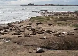 Año Nuevo State Park is a state park of California, United States, encompassing Año Nuevo Island and Año Nuevo Point, which are known for their pinniped rookeries. Located in San Mateo County, the low, rocky, windswept point juts out into the Pacific Ocean about 55 miles (89 km) south of San Francisco and the Golden Gate. Año Nuevo State Natural Reserve, formerly a separate unit of the California state park system, was merged into Año Nuevo State Park in October 2008.[2] The coastal geographic center, or coastal-midpoint of California is located at the northern end of this park at 37°09′58″N 122°21′40″W / 37.16611°N 122.36111°W, as the absolute geographic center of California falls at 37°09′58″N 119°26′58″W / 37.16611°N 119.44944°W.[3][4]