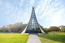 Early examples of A-frame religious buildings are the Frank Lloyd Wright designed First Unitarian Society of Madison, built 1949–1951, as well as the Lutheran Church of the Atonement, designed by Harris Armstrong and built in 1949 in Florissant, Missouri.[12] Charles E. Stade designed dozens of A-frame church buildings in the United States throughout the 1950s and 1960s,[13] along with Edward D. Dart and Edward Sövik.[14] The style was in 1960 used by the Catholic Church to build Saint Joseph Church, Lynden, Washington[6] just before the Our Lady of Fatima Roman Catholic Church in 1961. It was used most impressively for the United States Air Force Academy Cadet Chapel inaugurated in 1962.