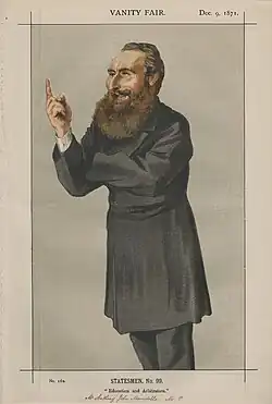 Anthony John Mundella PC (28 March 1825[1]– 21 July 1897) was an English manufacturer[2] and later a Liberal Party MP and Cabinet Minister who sat in the House of Commons of the United Kingdom from 1868 to 1897. He served under William Ewart Gladstone as Vice-President of the Committee of the Council on Education from 1880 to 1885 and as President of the Board of Trade in 1886 and from 1892 to 1894. As education minister he established universal compulsory education in Britain and played the major part in building the state education system. At the Board of Trade he was instrumental in the reduction of working hours and the raising of minimum ages in the employment of children and young people. He was among the first to prove the effectiveness of arbitration and conciliation in industrial relations.[3] He also brought in the first laws to prevent cruelty to children.[4] His political achievements in the late Victorian age are said to have anticipated 20th century society.[2]