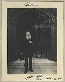 - Photograph, platinum print: by Sir John Benjamin Stone (1838–1914). A late portrait photograph of Mundella, seen standing at an entrance to the Houses of Parliament and dated May 1897 (two months before his death). A copy is held by the National Portrait Gallery[62] and another, with greater clarity of detail, by the UK Parliament's digital archive.[61]