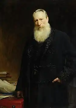 - Portrait in oil: by Sir Arthur Stockdale Cope RA (1857–1940). Painted on commission for the citizens of Sheffield to celebrate Mundella's 25th anniversary as an MP. A three-quarter length portrayal of Mundella as president of the Board of Trade with his hand resting on a departmental despatch box. The Sheffield Telegraph commented: "His face wears a somewhat sad and serious expression, and the artist has given him the full measure of his years".[56] The artist was Mundella's own choice. The painting was exhibited at the Royal Academy of Arts in London in the spring of 1894 and presented to Mundella on 11 Dec 1894 before being given to Sheffield Town Council.[57] It is on loan to Sheffield Galleries and Museums Trust.[58]