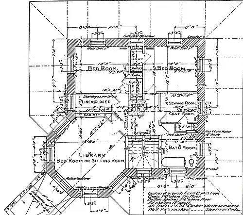 A detailed drawing of the building plans for the second floor of the model fireproof farm house, now known as the Stone House at Rock Lodge Club, from Himmelwright's book. (Click image to enlarge.)