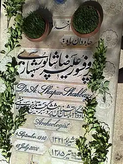Shahbazi wrote numerous classic books and articles on archaeology (Achaemenid, Sassanian and Islamic) in English, German, French, and the Persian language. He died on 15 July 2006 after a long battle with cancer.[3] He was transferred to Shiraz and buried in the memorials surrounding the Tomb of Hafez (Tomb of Hafez).[2]