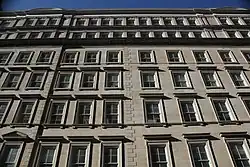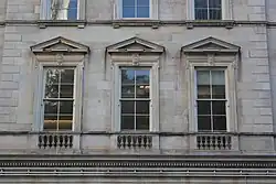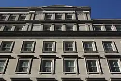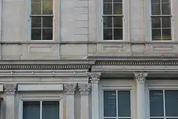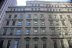 The upper stories are all made of marble, and each section is delineated by vertical quoins.[25][26][39] The second through fifth stories all contain rectangular windows, which gradually decrease in height on upper stories. A band course extends under all of the second-story windows.[25][26] In the projecting sections of the facade, the band course is interrupted by marble balustrades under the second-story windows, and there is a carved keystone and a triangular pediment above each of these windows. Within these sections, there are eared architraves above the windows on the third through fifth stories. In the non-projecting groups of windows, only the second-story windows have eared architraves, while the third to fifth stories have flat architraves.[e] In all bays, each window sill on the third through fifth stories is supported by two corbels; the sills below the third-story and fifth-story windows are linked by band courses.[25] A cornice with dentils runs above the fifth story.[25][41]