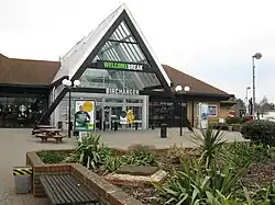 Entering Essex to the north of Bishop's Stortford and south of Stansted Mountfitchet, the A120 meets the B1383 Stansted Road at a roundabout. The route continues to bypass the north-eastern portion of Bishop's Stortford before meeting the A1250 Dunmow Road, then the M11 motorway at junction 8. The motorway runs southbound towards Harlow and London, and northbound towards Newmarket and Cambridge. Birchanger Green service station is accessed from the junction 8 roundabout. The roundabout also provides access to the B1256 towards Takeley and Little Canfield.
