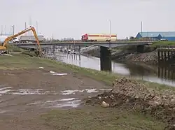 It passes Fosdyke to the west, where it crosses the River Welland at Fosdyke Bridge,[12] entering the district of South Holland a few hundred yards south of the bridge near the Ship Inn.[13] This was built as a swing bridge in 1911[14] but replaced in 1989 with the current fixed span. The loss of swing stranded the coaster, JonSue,[15] on the landward side. In March 1991 the ship was holed and sank when, on a falling tide, she settled on a dislodged limestone boulder used to reinforce the Welland channel and was cut up on site later the same year. The Macmillan Way crosses the river via this bridge also. At Moulton, there is a right turn for the B1357 for Moulton Seas End. At Whaplode as Washway Road, it passes Saracen's Head. At this point the former road passed through Saracen's Head, Holbeach and Fleet Hargate. The bypass, New Washway Road from Saracen's Head to Laurel Lodge Farm, opened in 1989. It meets the A151 on a newly built £5.4 million roundabout which opened in December 2017,[16] and there is also a roundabout for the B1168 (the former route through Holbeach). At Fleet it passes a Hawker Hunter installed near the road, and meets the B1515, the former route from Holbeach, west of Fleet Hargate. At Gedney it meets the former route, with St Mary Magdalene Church, Gedney seen to the south.