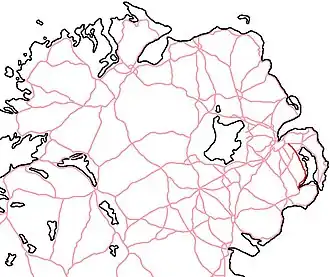 The A22 is a road in County Down, in Northern Ireland.[1] Its route starts in Dundonald and runs to Comber, forming the main transport corridor connecting Belfast and Comber, a commuter town situated 8 miles outside of the city. After bypassing Comber town itself, the route continues along the eastern shores of, though not directly adjacent to, Strangford Lough. The route passes through Lisbane, Balloo (near Killinchy), and Killyleagh, terminating in Downpatrick.