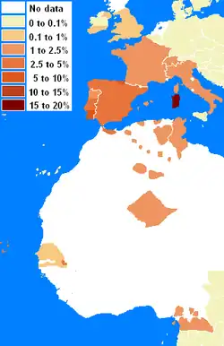 The full haplotype has a fairly contained distribution, from Sardinia to Northern Spain, to Southern Spain, Morocco, and Tunisia. Trace amounts of A30-B18-DR3 can be found in Germany, Italy.[8] However, in the case of the Germans the Cw allele was not typed so it is undetermined whether the haplotype is of the 'Basque' variant or the ancestral 'Sardinian' type, In addition in Sardinia the A30 serotype has never been resolved by high resolution genetyping and therefore the A*3002 has not been confirmed.